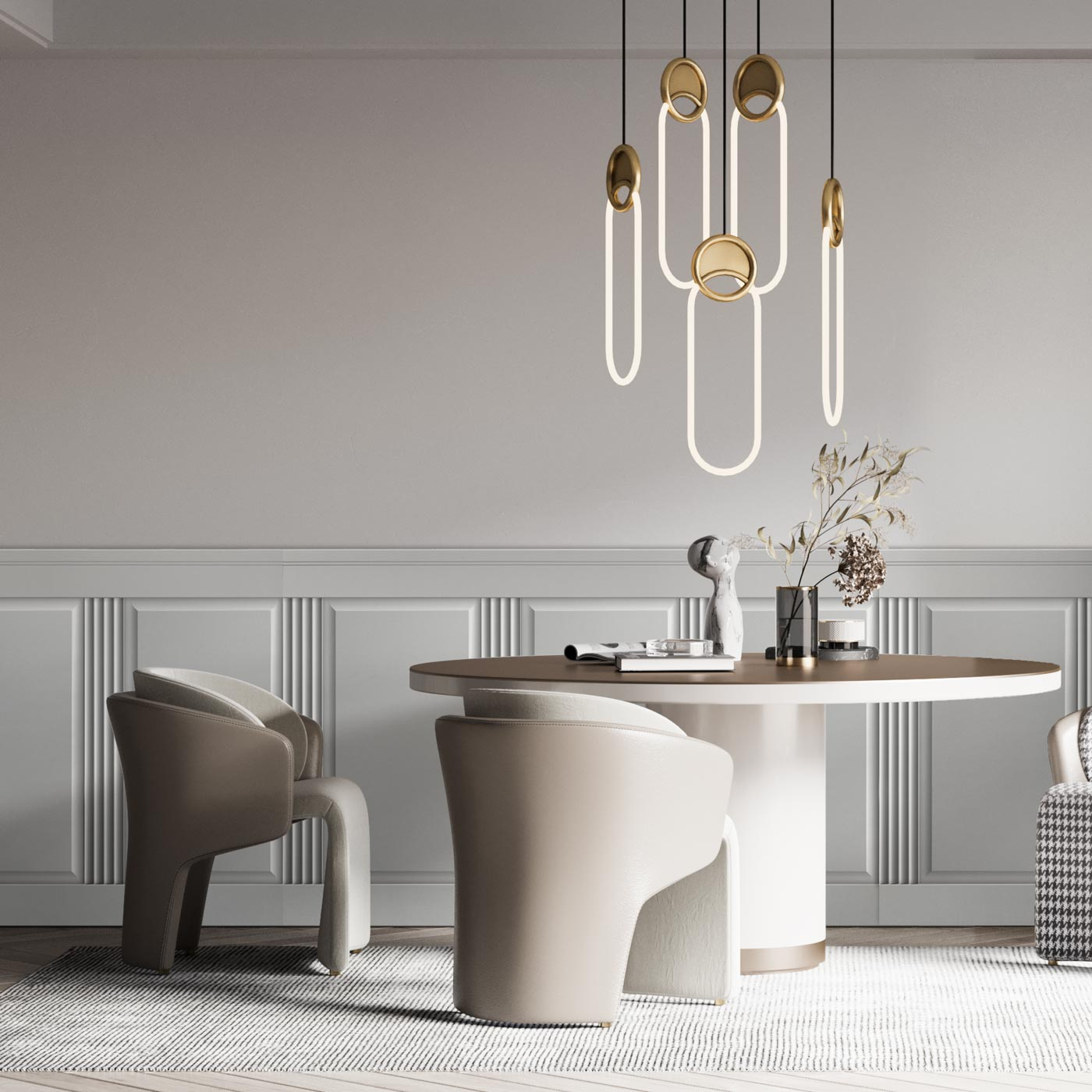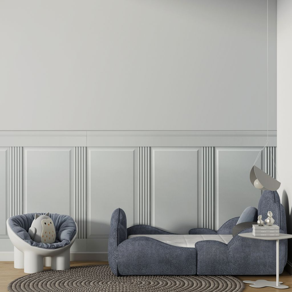 System oparty jest na prostokątnych panelach uzupełnionych listwami górnymi, dolnymi i pionowymi. Takie rozwiązanie pozwala swobodnie projektować zabudowę ścian, dopasowując ją do wymiarów pomieszczenia i oczekiwanego efektu wizualnego. Całość tworzy spójną, elegancką kompozycję inspirowaną klasycznymi angielskimi wnętrzami.