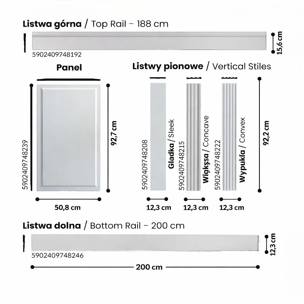 System składa się z gotowych paneli oraz listew górnych, dolnych i pionowych, które pozwalają stworzyć spójną i estetyczną zabudowę ściany. Modułowa konstrukcja ułatwia dopasowanie układu do różnych wysokości i szerokości ścian, a precyzyjne wymiary elementów zapewniają równy i powtarzalny efekt wizualny.