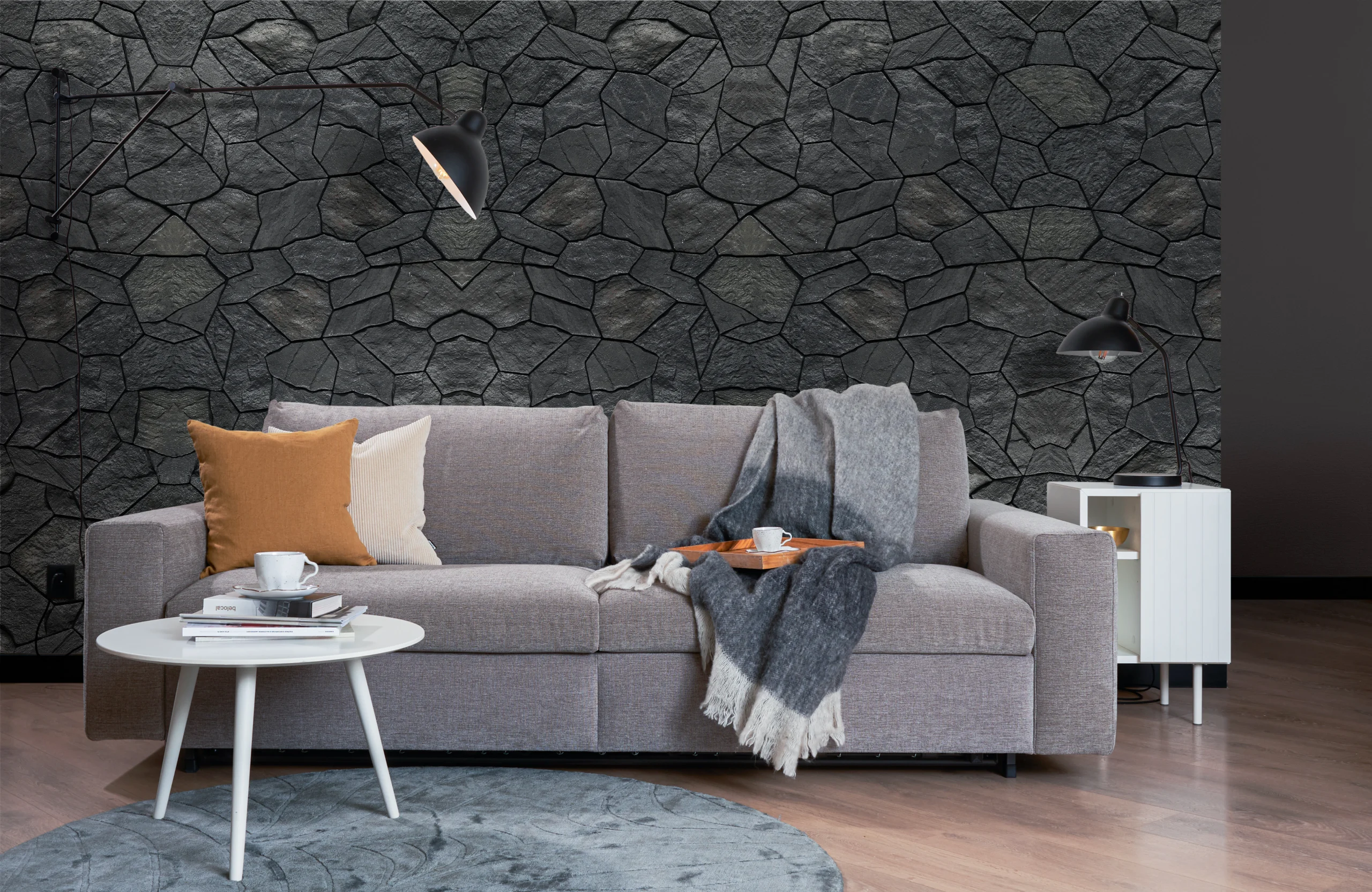 Płytka podstawowa Bergen 1 umożliwia tworzenie zróżnicowanych kompozycji ściennych dzięki nieregularnemu kształtowi i możliwości układania elementów w różnych konfiguracjach. Dla uzyskania najbardziej naturalnego efektu zaleca się obracanie płytek co 60°, co ogranicza powtarzalność wzoru i pozwala uzyskać unikalny rysunek kamiennej powierzchni.