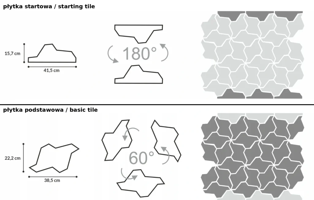 Płytki startowe mogą być również wykorzystane do estetycznego zakończenia układu bez konieczności docinania elementów, tworząc prostą, równą linię wieńczącą. Podobnie jak płytki podstawowe, nie wymagają fugowania.
