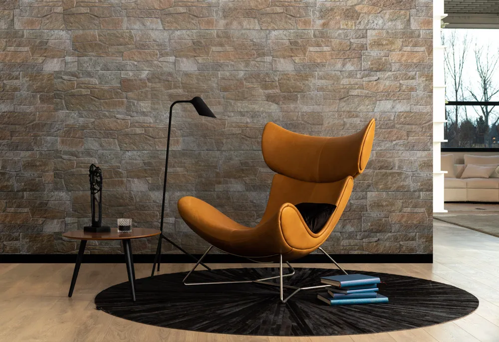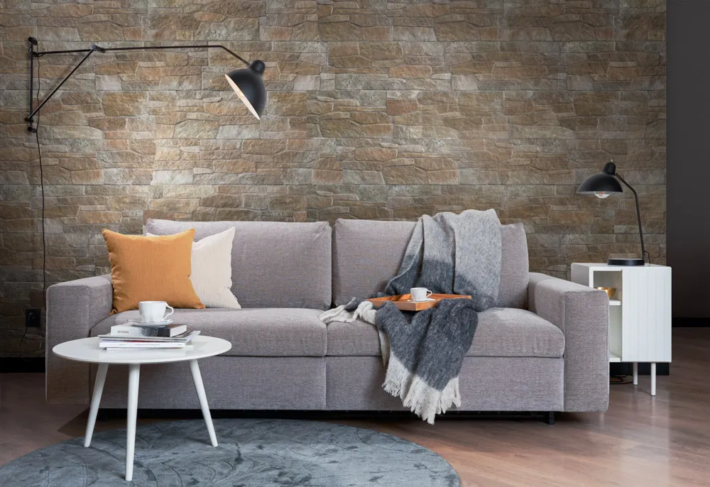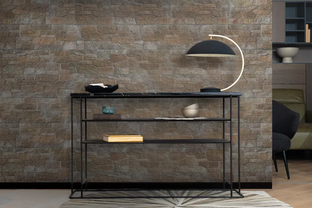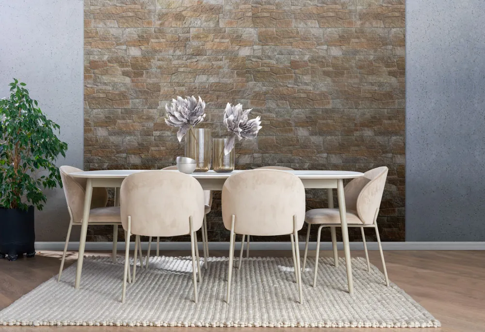 Castello Sabbia wyróżnia się ciepłymi, naturalnymi odcieniami brązu oraz wyrazistą, geometryczną strukturą inspirowaną kamieniem łupanym. Doskonale komponuje się z nowoczesną architekturą, podkreślając charakter elewacji i nadając wnętrzom elegancki, architektoniczny wygląd.