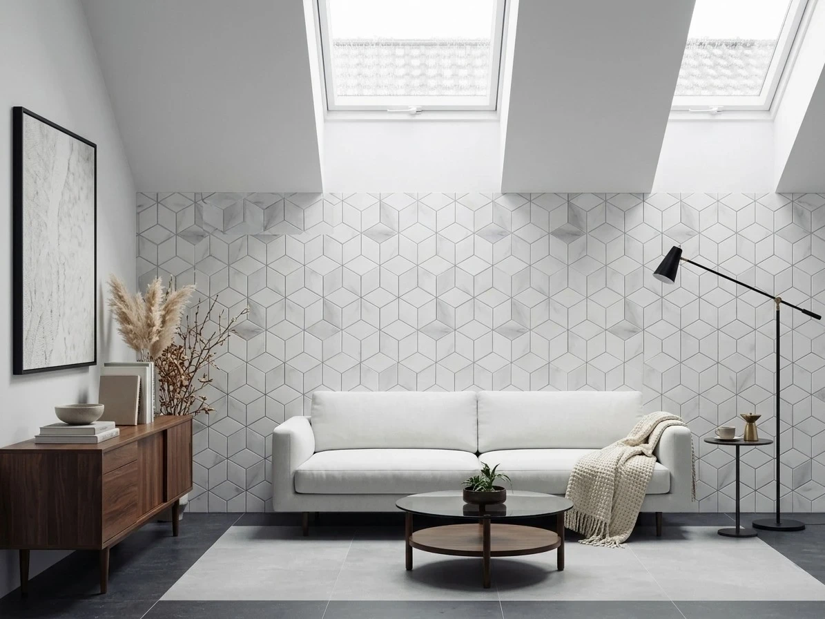Panel ścienny White Cube to nowoczesny, samoprzylepny panel dekoracyjny wykonany z trwałego PCV, który pozwala szybko odmienić wygląd wnętrza bez remontu, wiercenia czy użycia specjalistycznych narzędzi. Geometryczny wzór trójwymiarowych sześcianów tworzy efekt głębi i nadaje ścianie designerski, nowoczesny charakter.