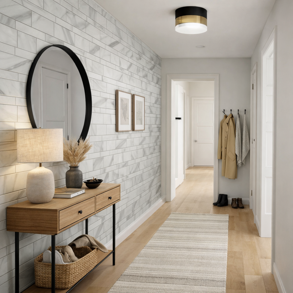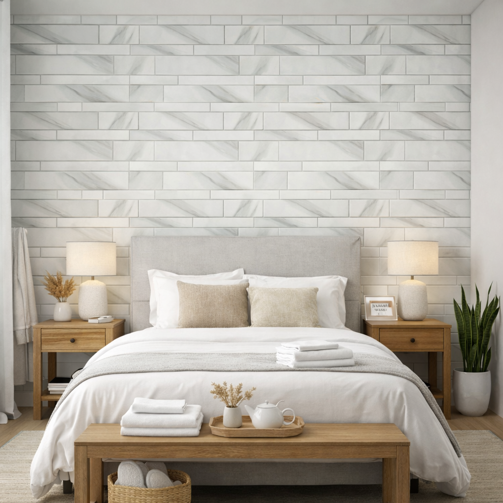 Dekoracyjny panel ścienny White Marble to szybki sposób na odświeżenie wnętrza bez remontu. Samoprzylepna warstwa umożliwia łatwy montaż bez kleju i narzędzi, a elegancki wzór białego marmuru nadaje ścianom nowoczesny i ponadczasowy charakter. Panel jest lekki, łatwy w docinaniu i prosty w utrzymaniu czystości. Przeznaczony do użytku wewnętrznego, sprawdzi się w salonie, kuchni, sypialni czy przedpokoju, również w pomieszczeniach o podwyższonej wilgotności (poza bezpośrednim kontaktem z wodą).